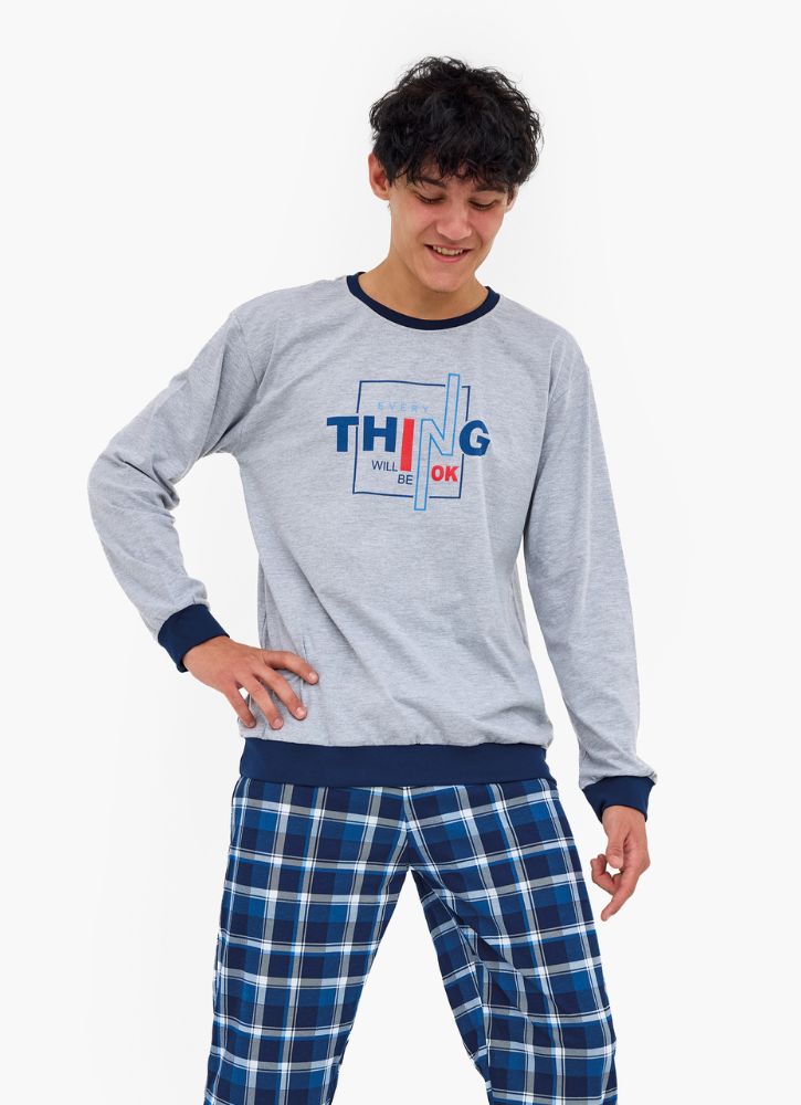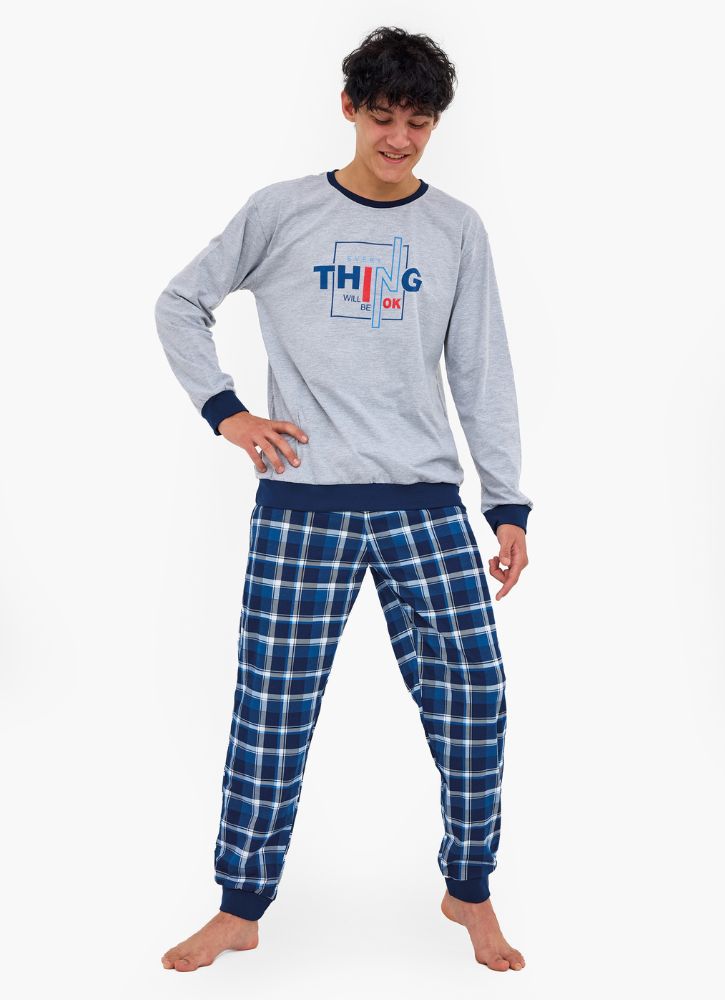 Komfortowa bawełniana piżama młodzieżowa dla starszych chłopców polskiego producenta firmy Cornette z serii Fun&Young. Bluzka z długim rękawem ze ściągaczami w kolorze szarym melanżowym z ozdobnym kolorowym nadrukiem. Spodnie w kratkę, długie długie w kratkę Fason: Długie spodnie, długi rękaw