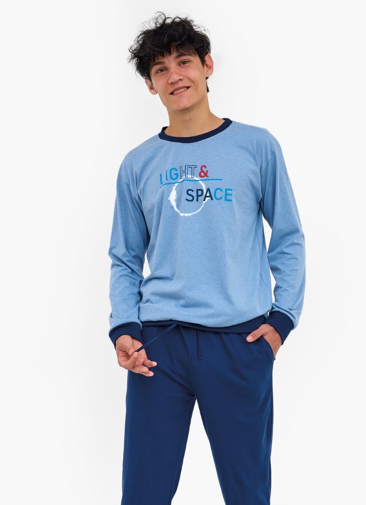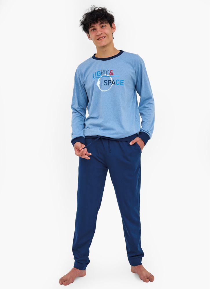 Komfortowa bawełniana piżama młodzieżowa dla starszych chłopców polskiego producenta firmy Cornette z serii Fun&Young. Bluzka z długim rękawem ze ściągaczami w kolorze niebieskim z ozdobnym kolorowym nadrukiem. Spodnie gładkie, długie ze ściągaczami na dole w kolorze granatowym.