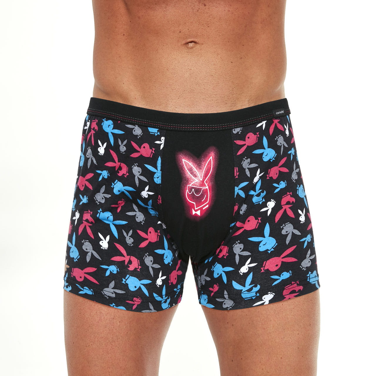 Super wzór Bunny przypominający króliczki Playboy'a to produkt idealny dla odważnych i pewnych siebie mężczyzn. Z przodu fluorescencyjna głowa królika, która świeci w ciemności . Komfortowe bokserki zawdzięczają swoje właściwości elastycznemu materiałowi, a także precyzyjnemu wykonaniu. Płaskie szwy są delikatne dla skóry, bezuciskowe wykończenie nogawek zapewnia maksymalny komfort, a podtrzymująca guma w pasie została obszyta miękkim materiałem, delikatnym dla skóry.