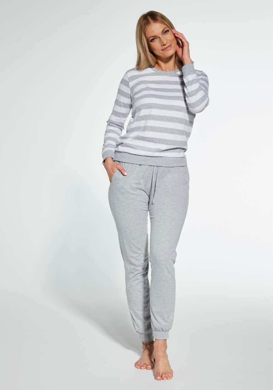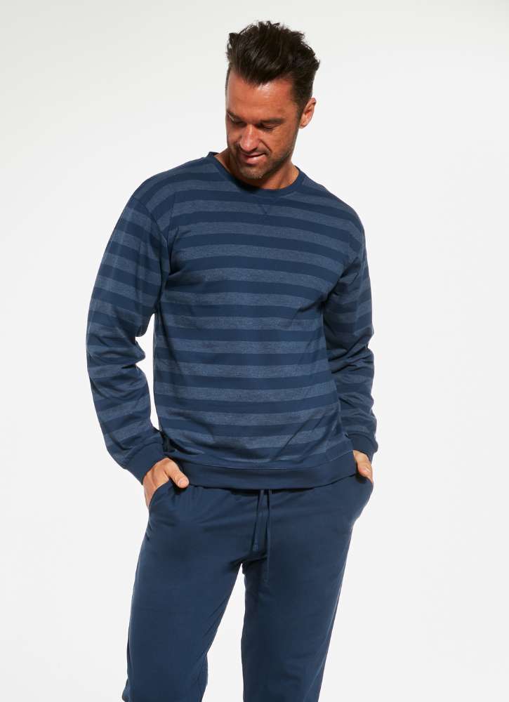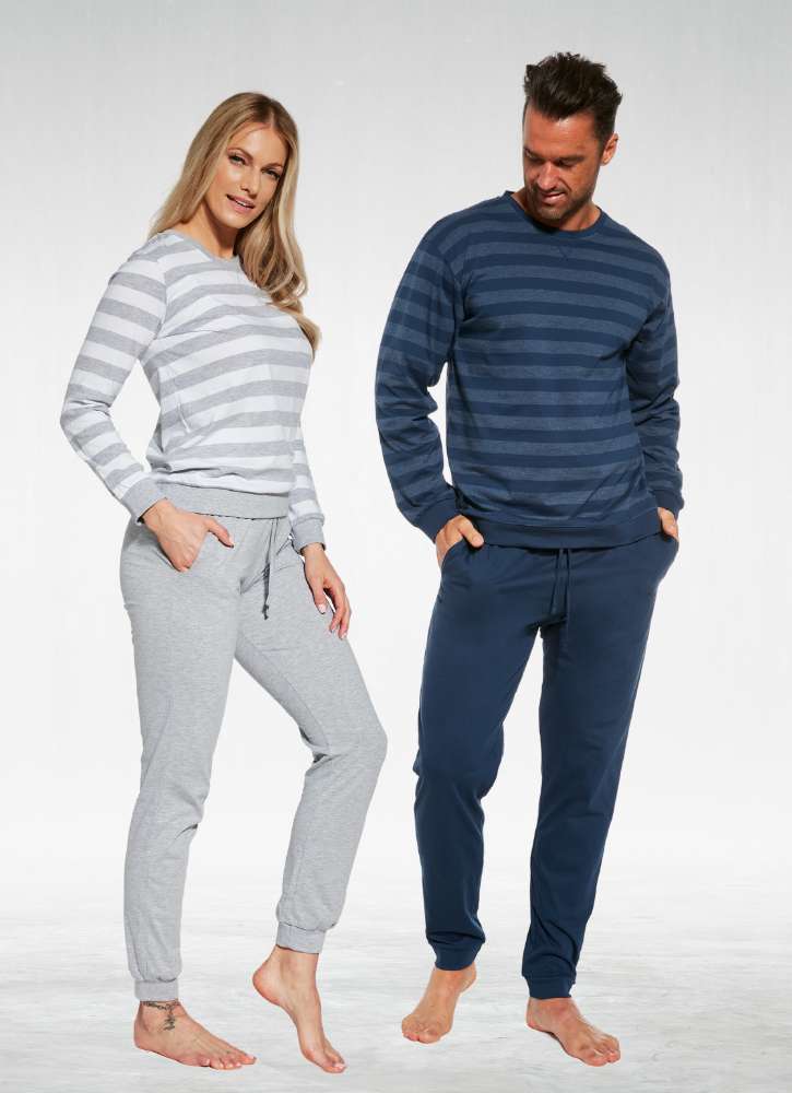 Wygodne i komfortowe piżamy dla par firmy Cornette. Piżama damska składa się z bluzy z długim rękawem w szaro-białe paski i szarych melanżowych spodni, które posiadają troczek do ściągnięcia i praktyczne kieszenie. Piżama męska utrzymana jest w kolorze jeansowym. Bluza z długim rękawem posiada na całej powierzchni wzór w niebieskie melanżowe paski, do kompletu długie, gładkie spodnie z kieszeniami.