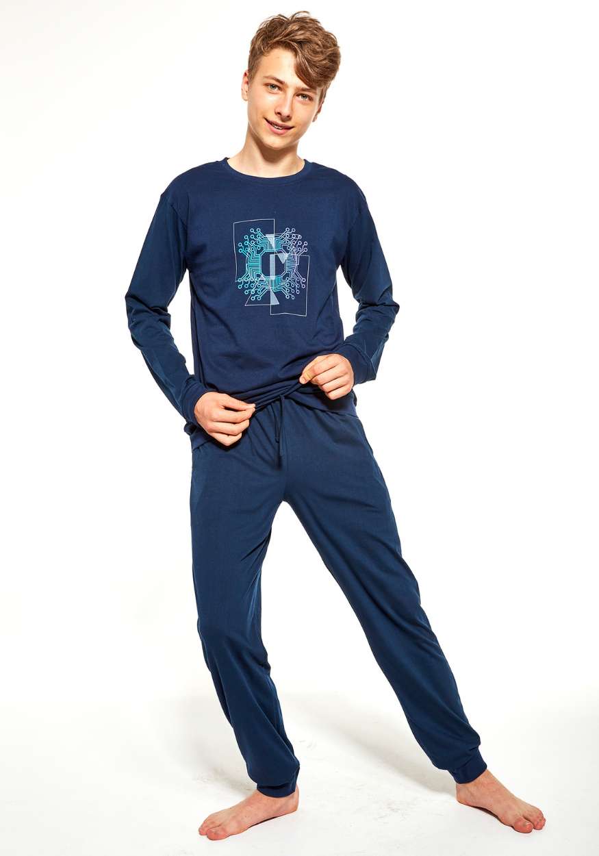 Komfortowa bawełniana piżama młodzieżowa dla chłopców polskiego producenta firmy Cornette z serii Fun&Young Bluzka z długim rękawem ze ściągaczami w kolorze granatowym z ozdobnym kolorowym nadrukiem. Spodnie gładkie, długie ze ściągaczami na dole w kolorze granatowym.