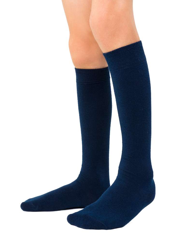 - Podkolanówki gładkie dla dzieci w kolorze granatowym wykonane wysokogatunkowej bawełny z dodatkiem włókien elastycznych.